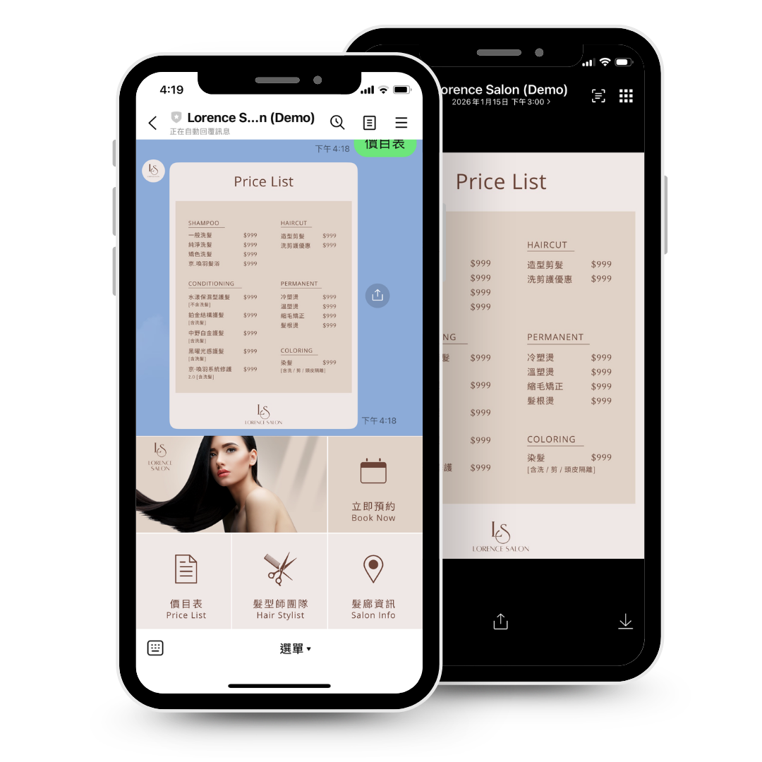 適用於 LINE 官方帳號的單張視覺設計,可呈現價目表、課程與產品推廣等內容。不含按鈕功能,但可放大閱讀,適合資訊較完整的版面呈現。